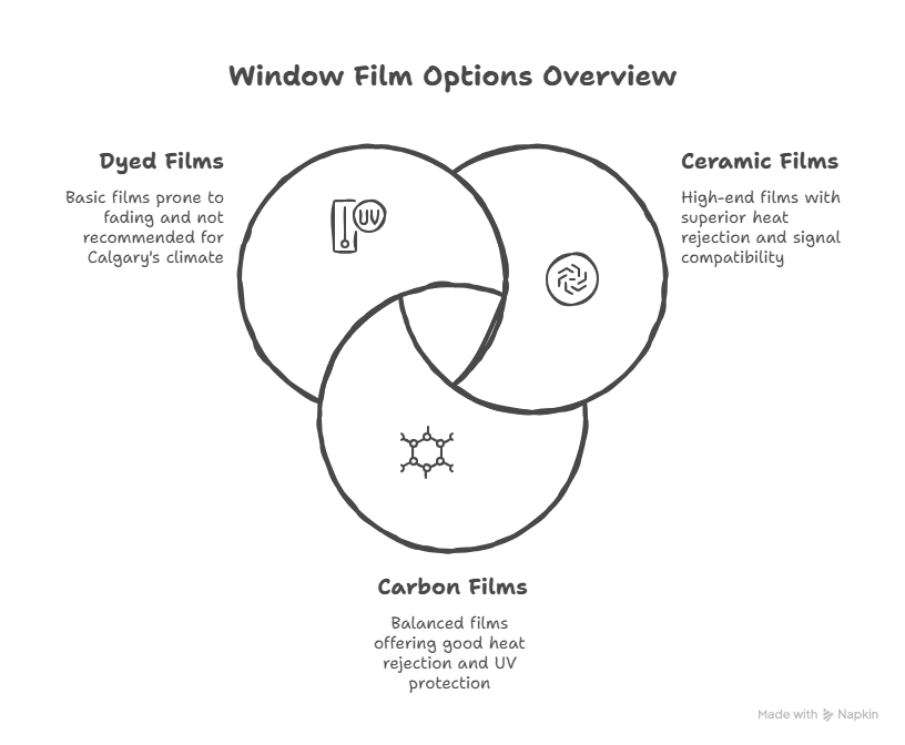 Carbon window films offer an excellent balance of performance and value. They provide strong heat rejection and UV protection while maintaining an attractive matte-black appearance that complements any vehicle color. Carbon films don’t fade like dyed films and offer good durability in Calgary’s climate.